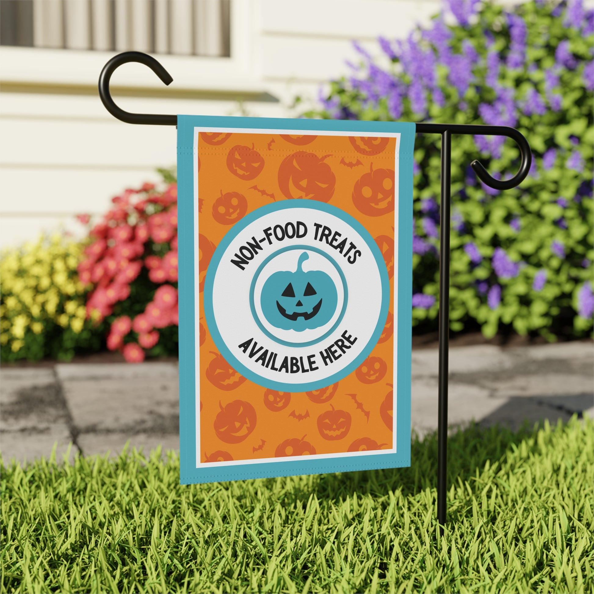 Welcome trick-or-treaters with this Food Allergy Awareness Halloween Garden Flag! Designed with a bright orange pumpkin alongside a cheerful teal smiling pumpkin, this festive banner signals to families that your home offers safe, non-food treats for children with food allergies.
